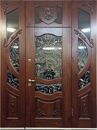 Поговорим об отделке. Вариантов декора дверей много. В большинстве случаев, для отделки элитных дверей используется массив натурального дерева или натуральный шпон с фрезеровкой. Цвет двери так же делается по желанию заказчика. Очень красиво и представительно выглядят двери с ковкой и стеклом.